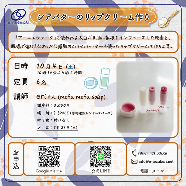 こんにちは!韮崎市で「ずっとストレスのない家づくり」をしている志村建設です。志村建設ではほぼ毎月、家づくりとは趣向を変えたイベントを開催しています。今回は、10月4日(土)に開催するリップクリーム作りのご案内をいたします。